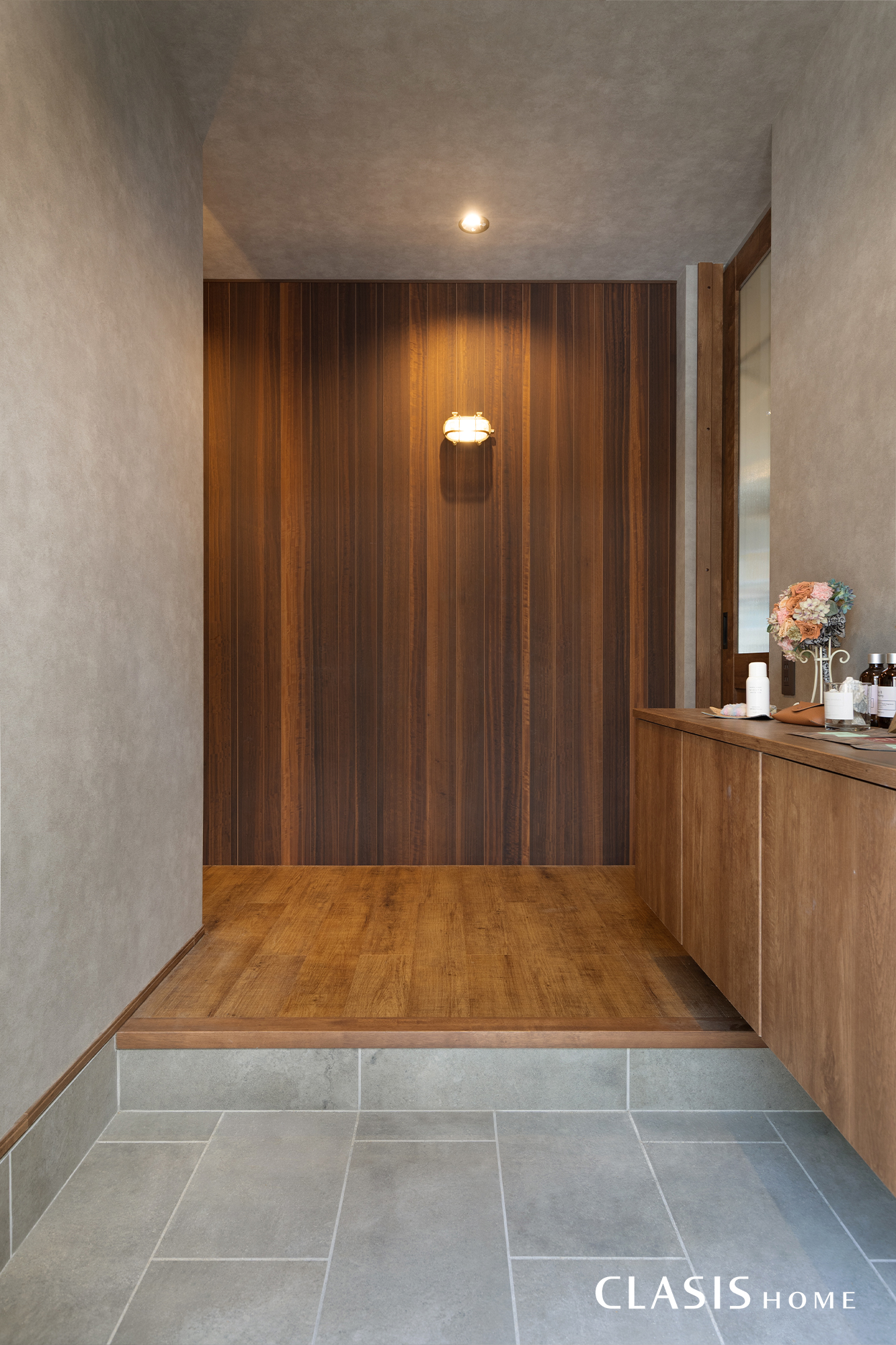 住居部分の玄関ホール。アクセントとしてユーカリ材を板張りしています。温かなブラウンカラーがシックな雰囲気で家族を出迎えます。
